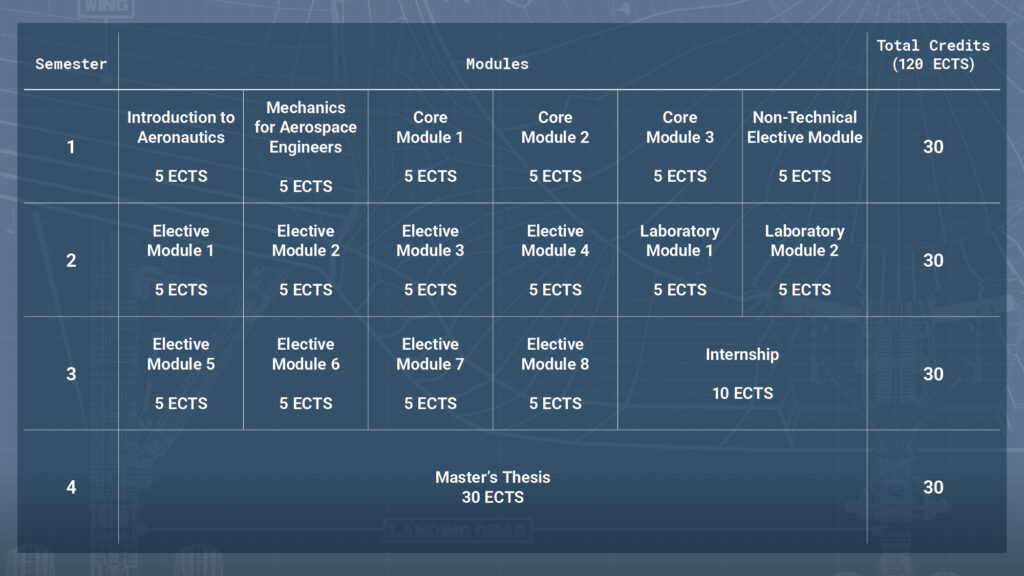 The MSc in Aerospace Engineering, totalling 120 ECTS, spans 4 semesters over 2 years, comprising a combination of compulsory, core, lab and elective modules (80 ECTS), a 3-month internship (10 ECTS), and a Master’s thesis (30 ECTS).